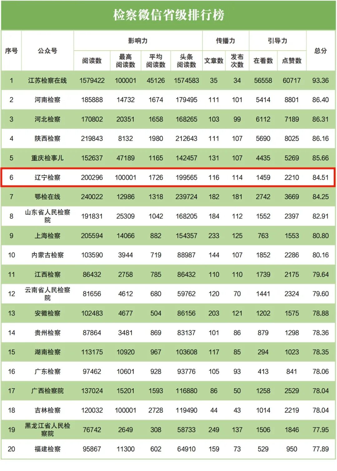 检察微信省级排行榜中,辽宁省检察院排名第六;
