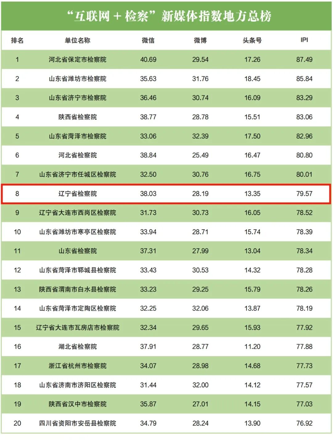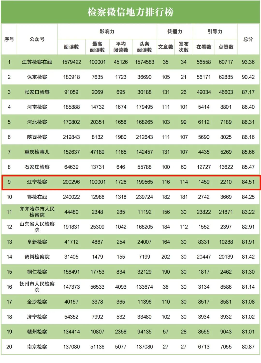 检察微信地方排行榜中,辽宁省检察院排名第九;
