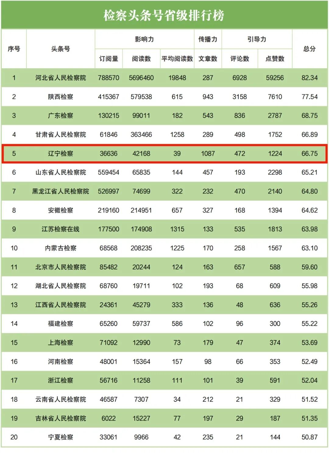 检察头条号省级排行榜中,辽宁省检察院排名第五;