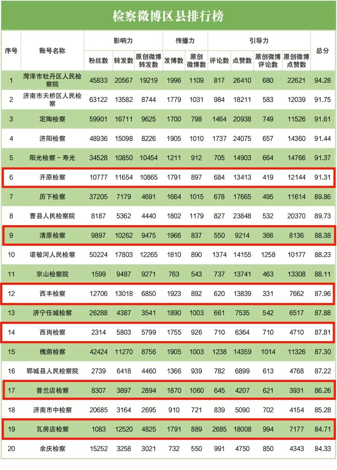 检察微博区县排行榜中,开原市检察院排名第六,清原县检察院排名第九,西丰县检察院排名第十二,大连市西岗区检察院排名第十四,大连市普兰店区检察院排名第十七,瓦房店市检察院排名第十九。