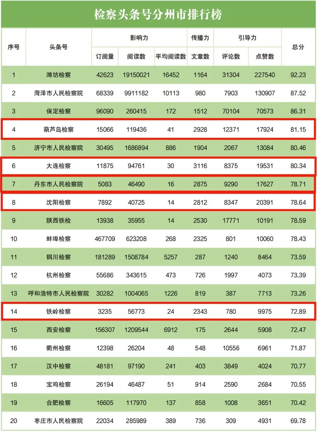 检察头条号地方排行榜中,喀左县检察院排名第十二,凤城市检察院排名第十三,葫芦岛市检察院排名第十四,大连市检察院排名第十九,大连市西岗区检察院排名第二十;