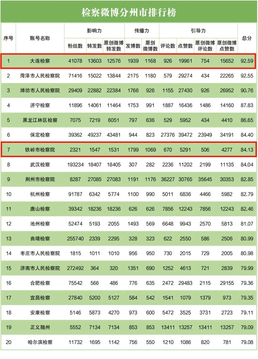 检察微博地方排行榜中,大连市检察院排名第二;开原市检察院排名第八,清原县检察院排名第十二,西丰县检察院排名第十五,大连市西岗区检察院排名第十八;