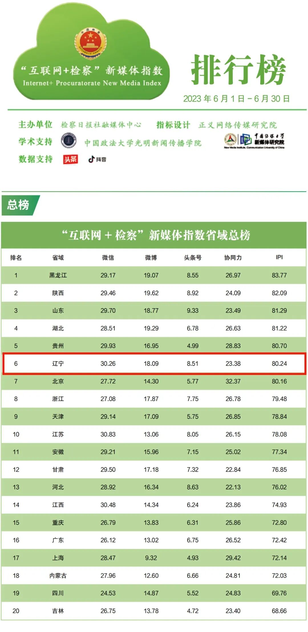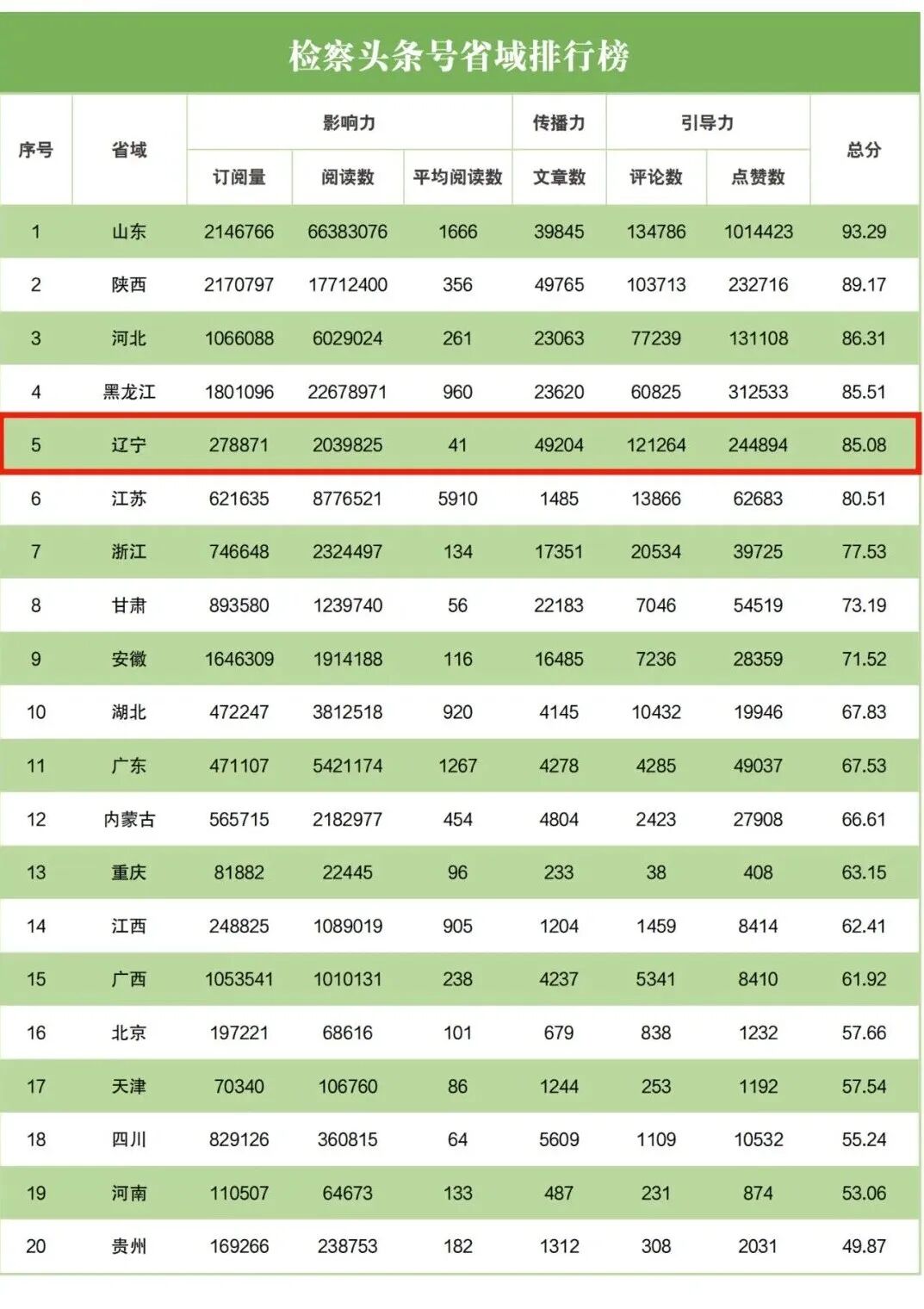 头条榜:检察头条号省域排行榜中,辽宁排名第五;