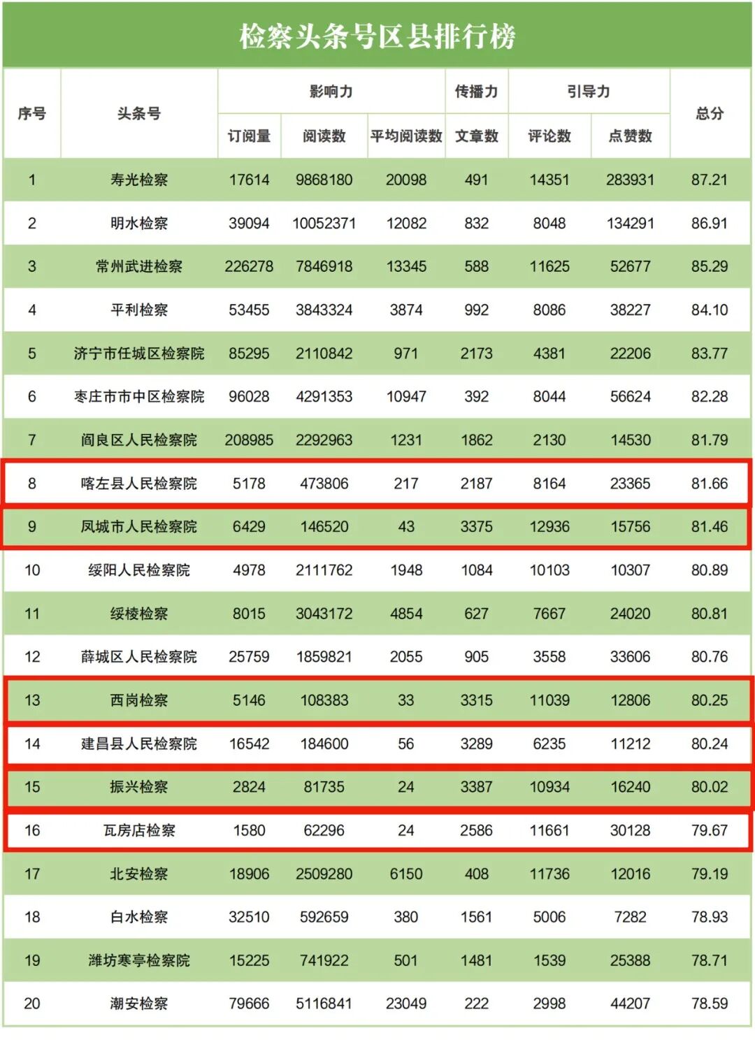 检察头条号区县排行榜中,喀左县检察院排名第八,凤城市检察院排名第九,大连市西岗区检察院排名第十三,建昌县检察院排名第十四,丹东市振兴区检察院排名第十五,瓦房店市检察院排名第十六。