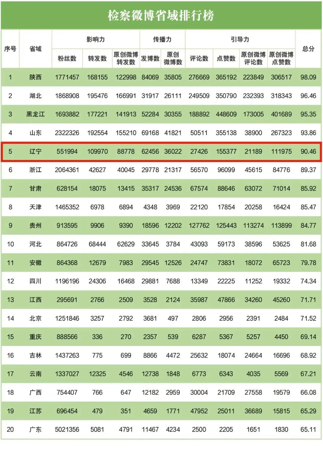 微博榜:检察微博省域排行榜中,辽宁排名第五;