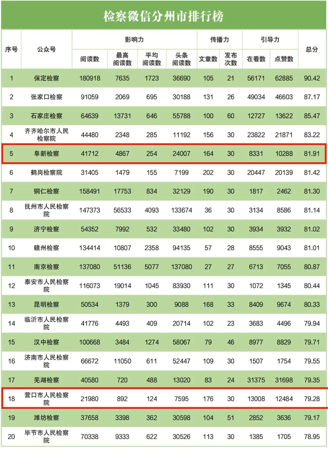 检察微信分州市排行榜中,阜新市检察院排名第五,营口市检察院排名第十八;