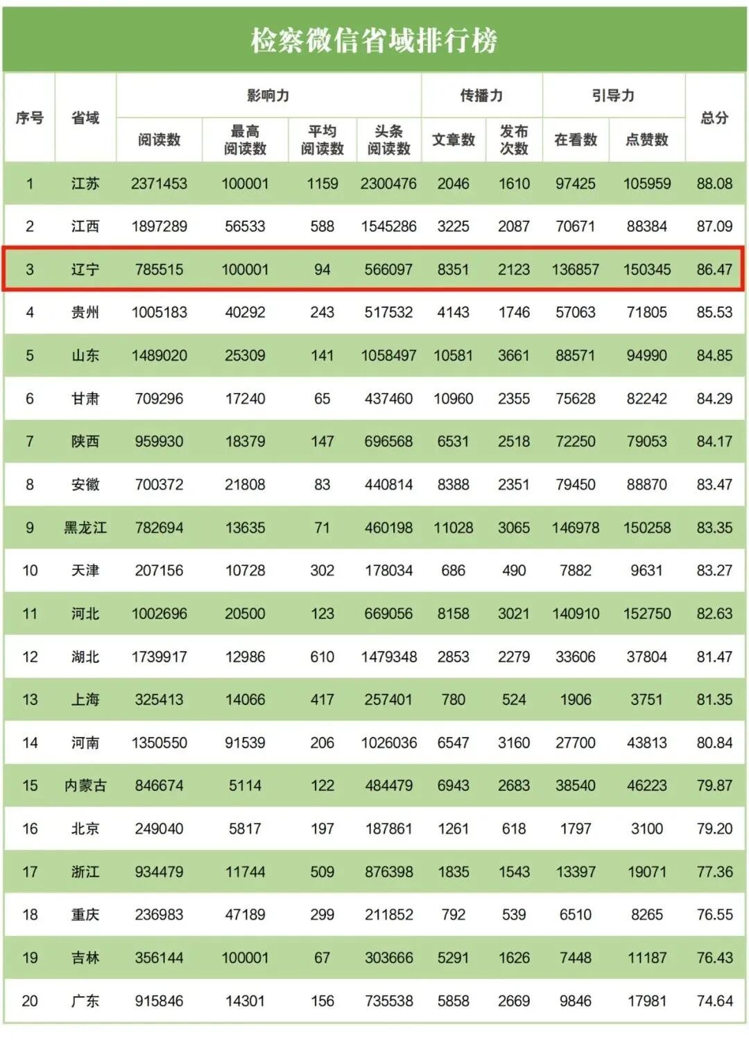 微信榜:检察微信省域排行榜中,辽宁排名第三;