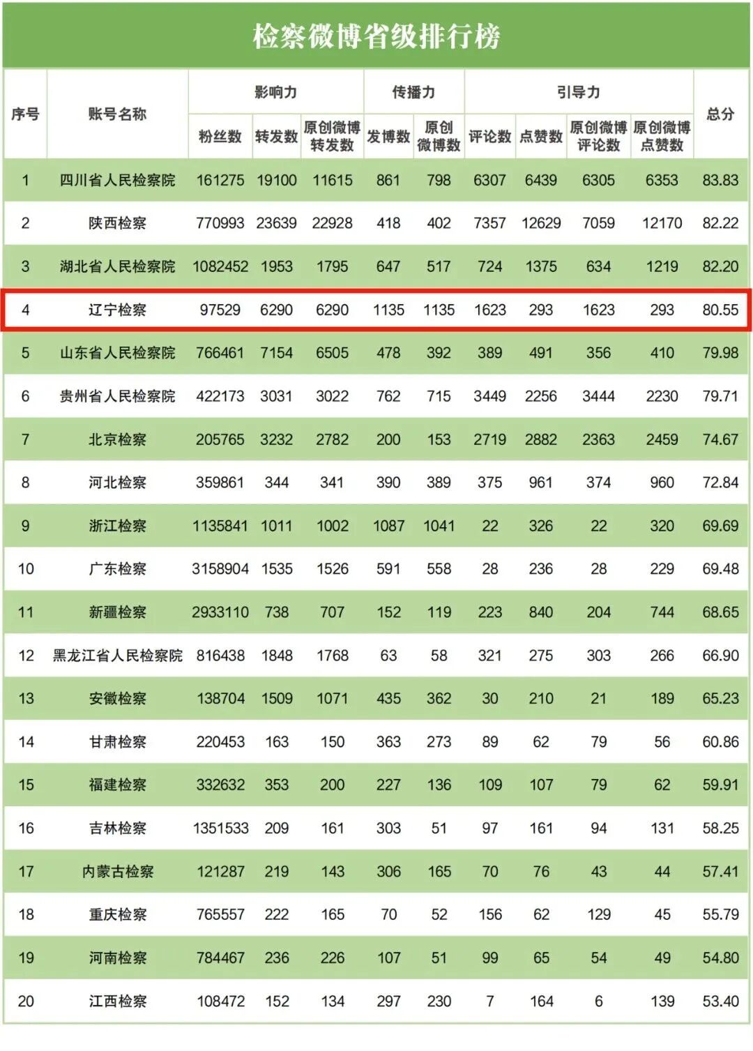 检察微博省级排行榜中,辽宁省检察院排名第四;