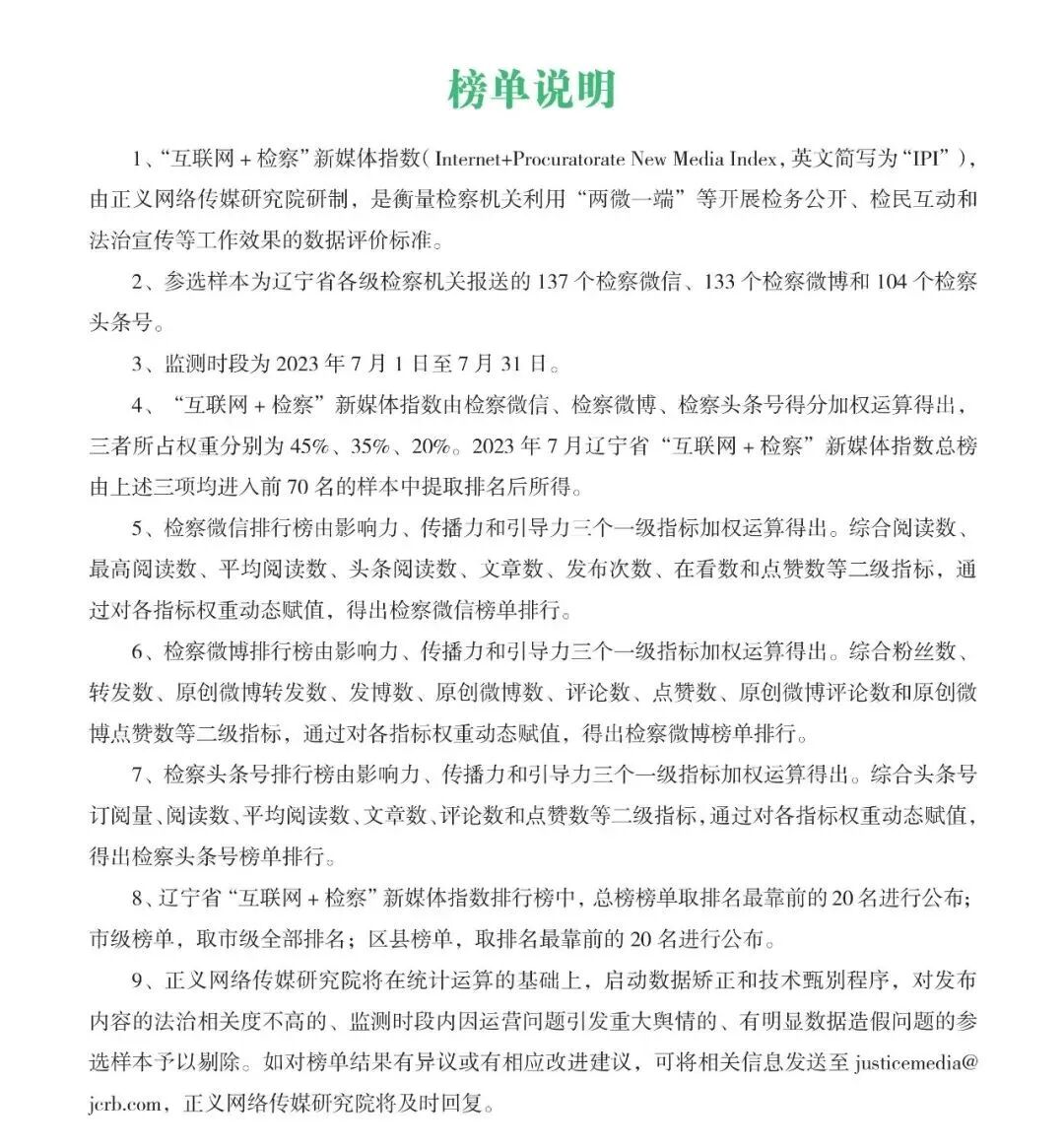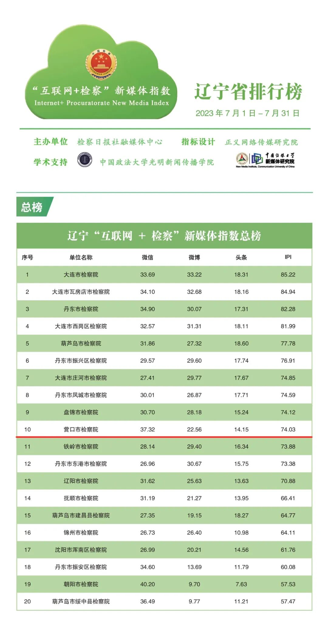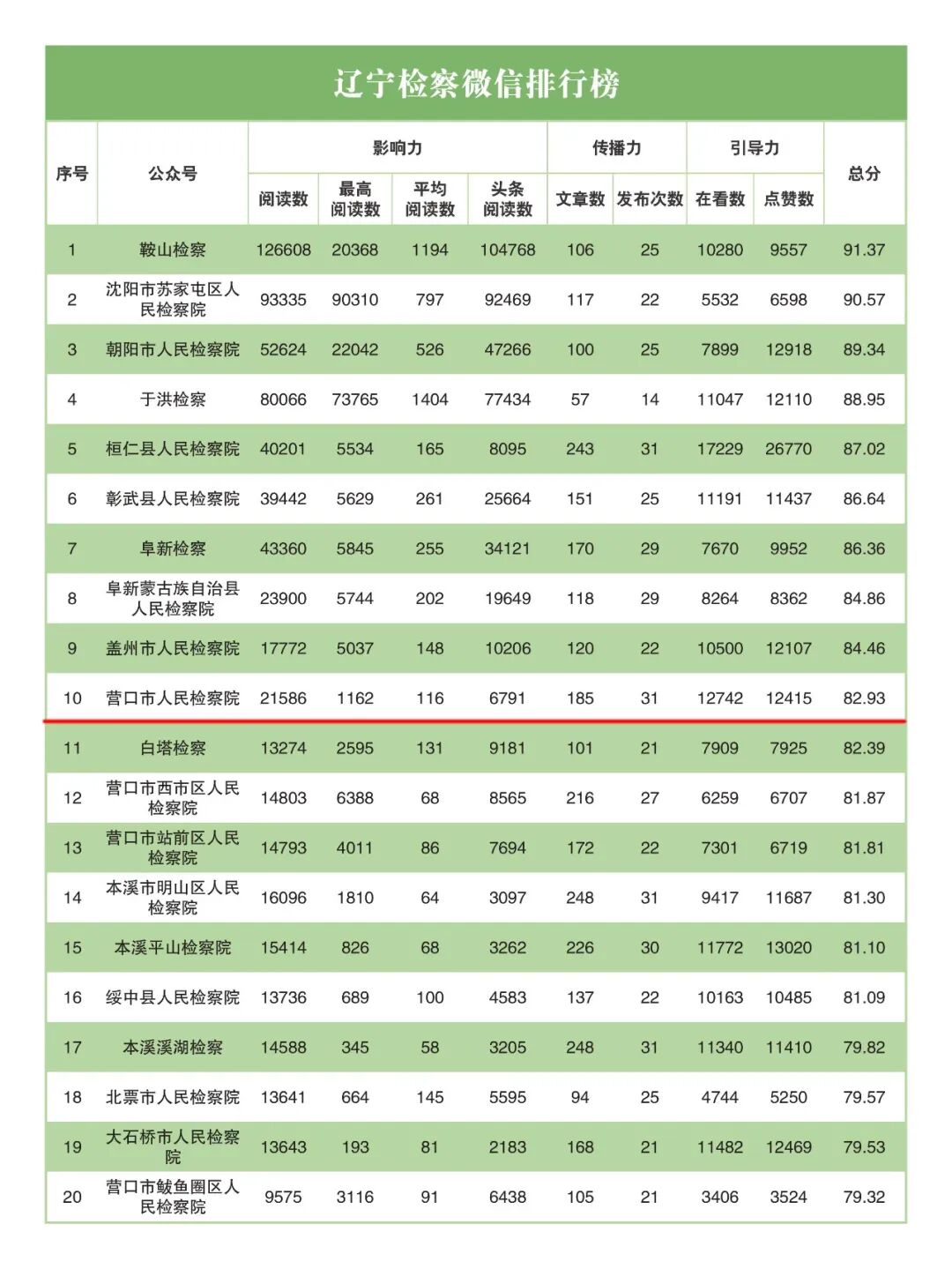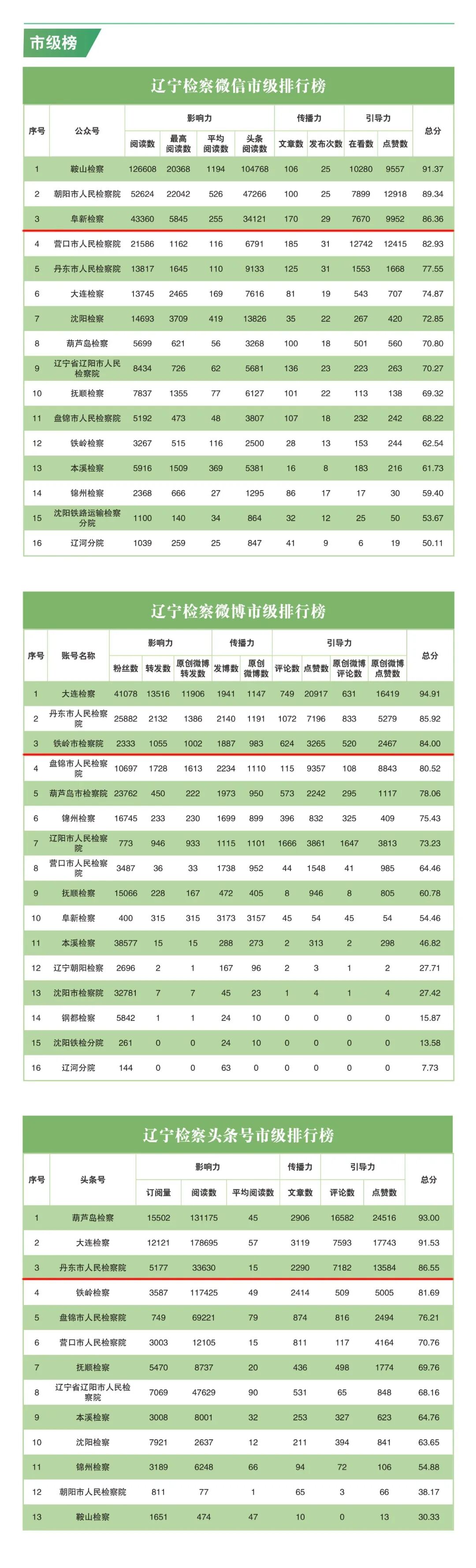 市级排行榜中,鞍山市检察院、朝阳市检察院、阜新市检察院分别位居微信排行榜前三名;大连市检察院、丹东市检察院、铁岭市检察院分别位居微博排行榜前三名;葫芦岛市检察院、大连市检察院、丹东市检察院分别位居头条号排行榜前三名。