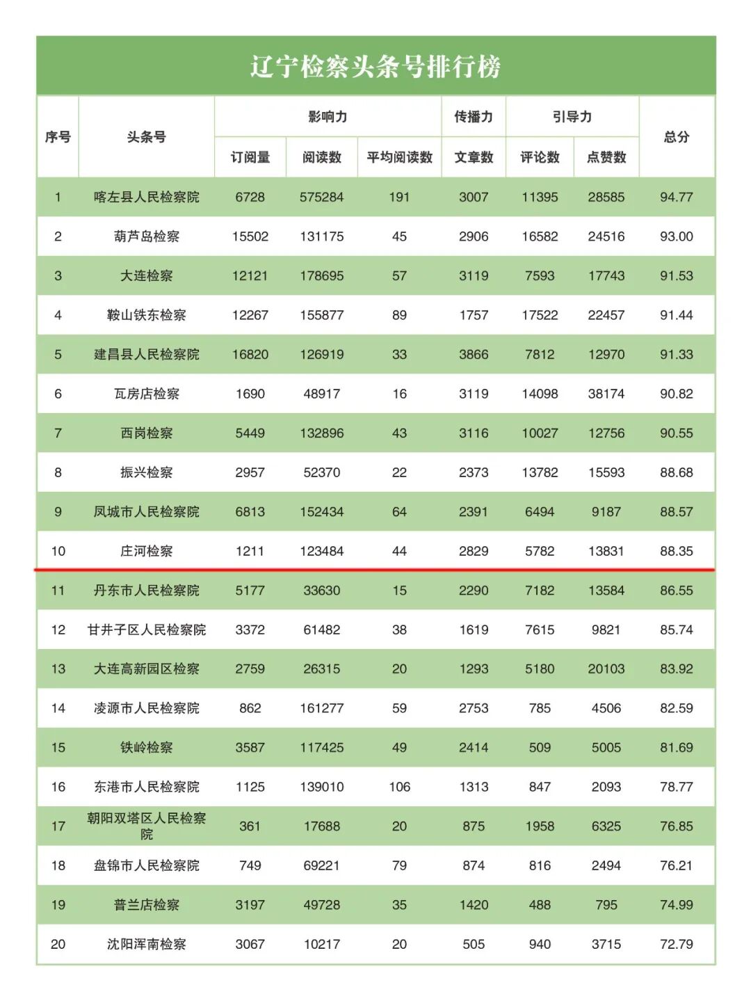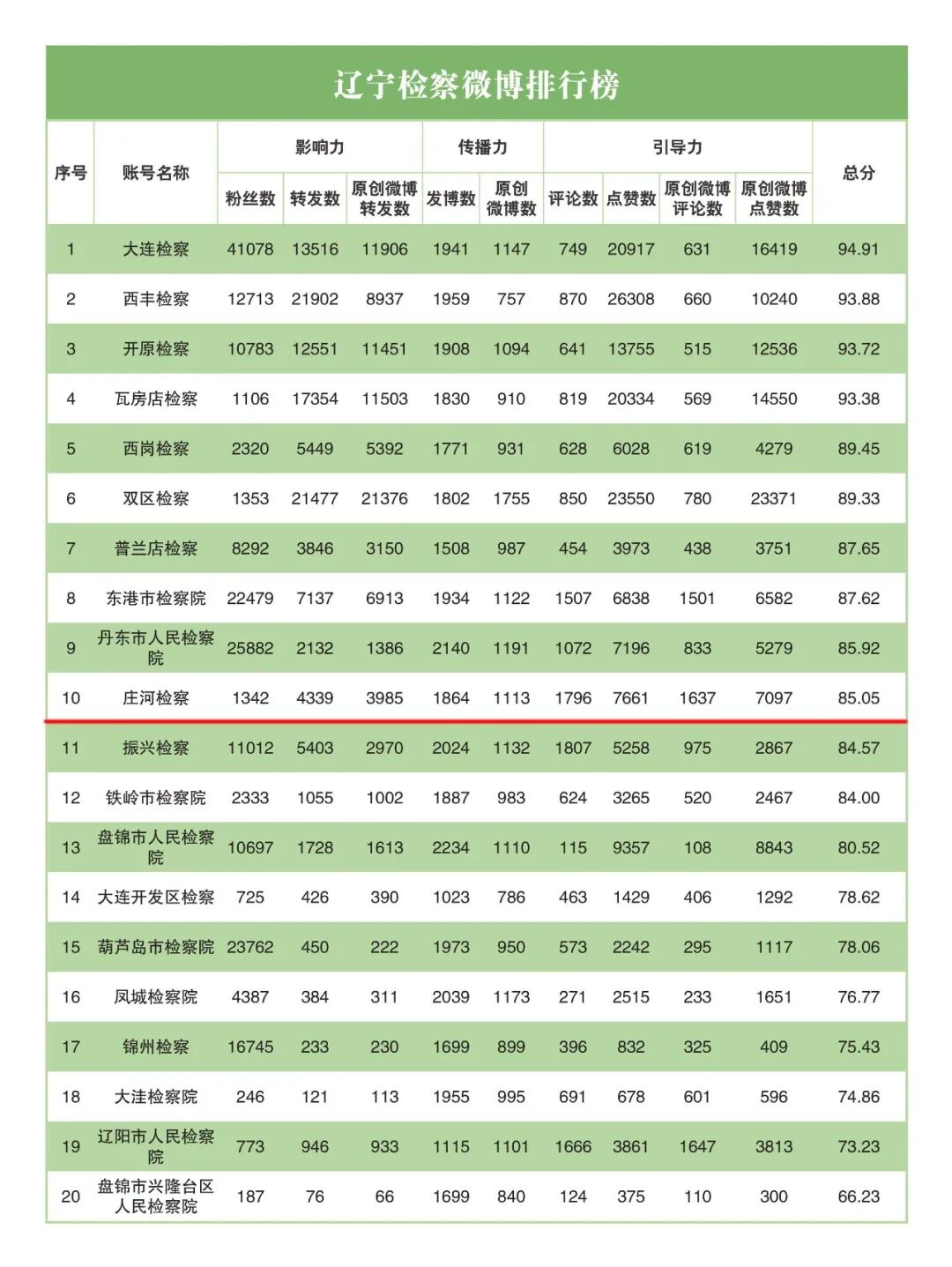 榜单显示,大连市检察院、瓦房店市检察院、丹东市检察院、大连市西岗区检察院、葫芦岛市检察院、丹东市振兴区检察院、庄河市检察院、凤城市检察院、盘锦市检察院、营口市检察院分别位居新媒体指数总榜前十名;鞍山市检察院、沈阳市苏家屯区检察院、朝阳市检察院、沈阳市于洪区检察院、桓仁县检察院、彰武县检察院、阜新市检察院、阜蒙县检察院、盖州市检察院、营口市检察院分别位居微信总榜前十名;大连市检察院、西丰县检察院、开原市检察院、瓦房店市检察院、大连市西岗区检察院、盘锦市双台子区检察院、大连市普兰店区检察院、东港市检察院、丹东市检察院、庄河市检察院分别位居微博总榜前十名;喀左县检察院、葫芦岛市检察院、大连市检察院、鞍山市铁东区检察院、建昌县检察院、瓦房店市检察院、大连市西岗区检察院、丹东市振兴区检察院、凤城市检察院、庄河市检察院分别位居头条号总榜前十名。