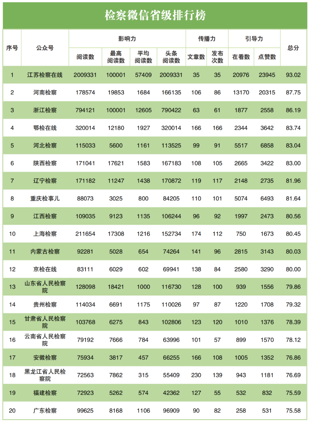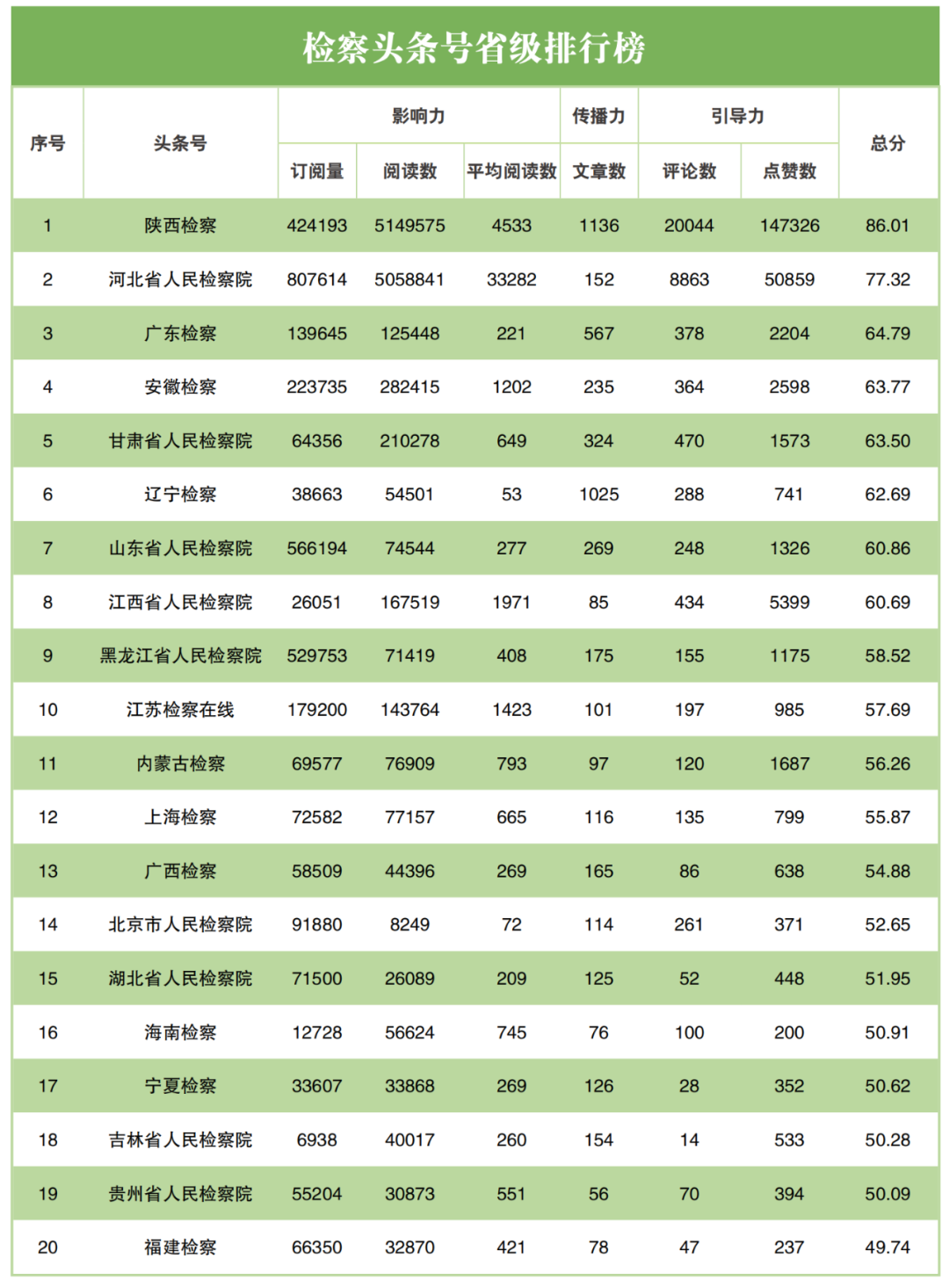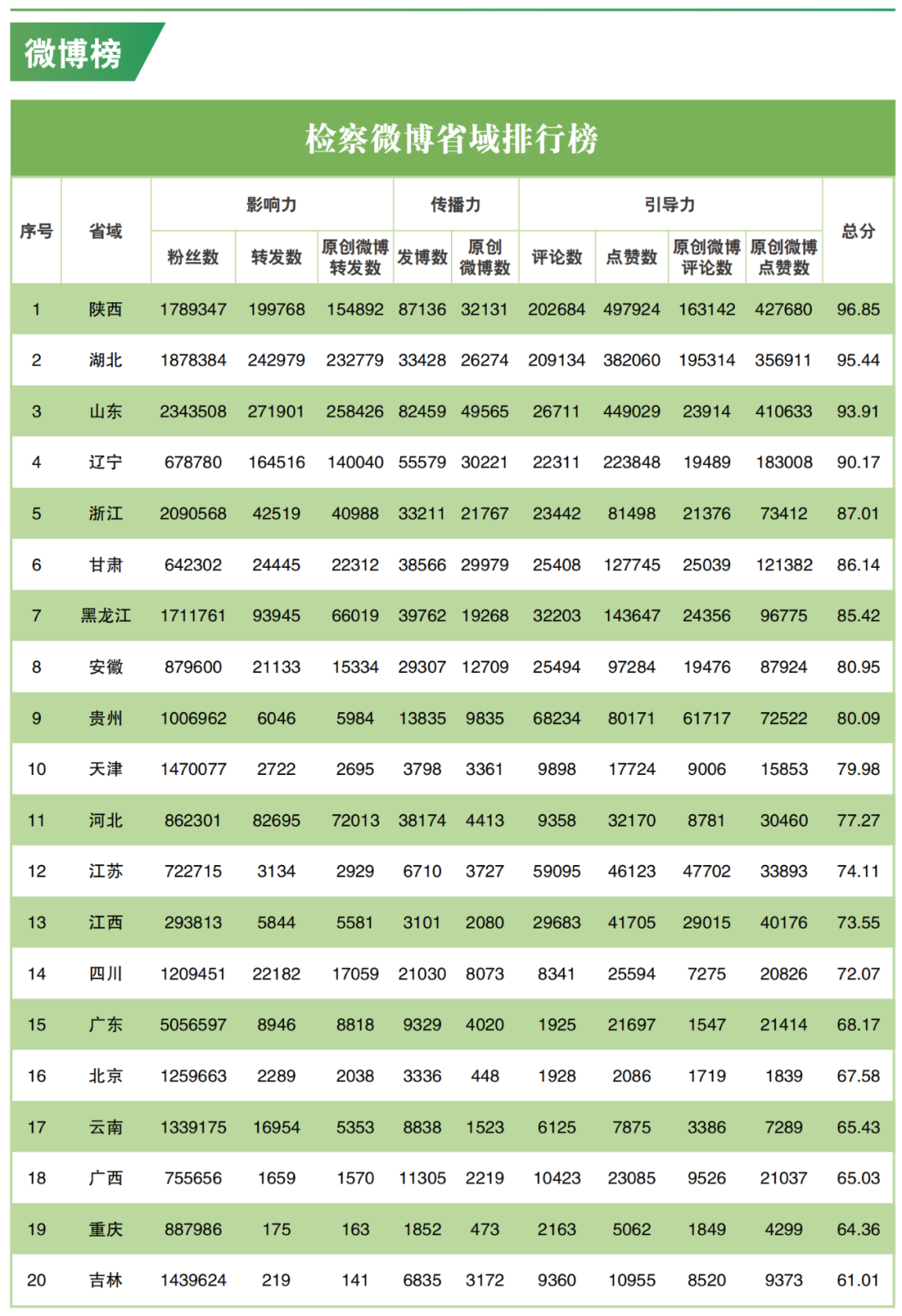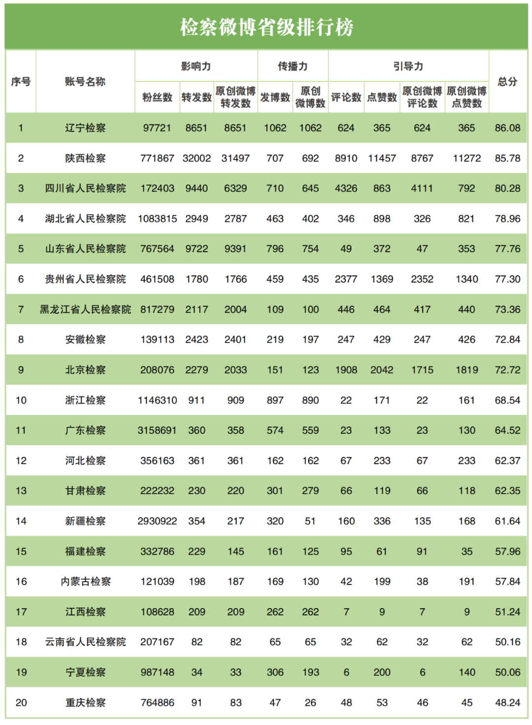 5.“互联网+检察”新媒体指数排行榜由省域榜和地方榜组成。其中,省域榜是以全国不同省级行政区域内新媒体各项基础指标的总数和均值,按照30%、70%的权重运算得出。地方榜则是以每个检察机关新媒体各项基础指标加权运算得出。
