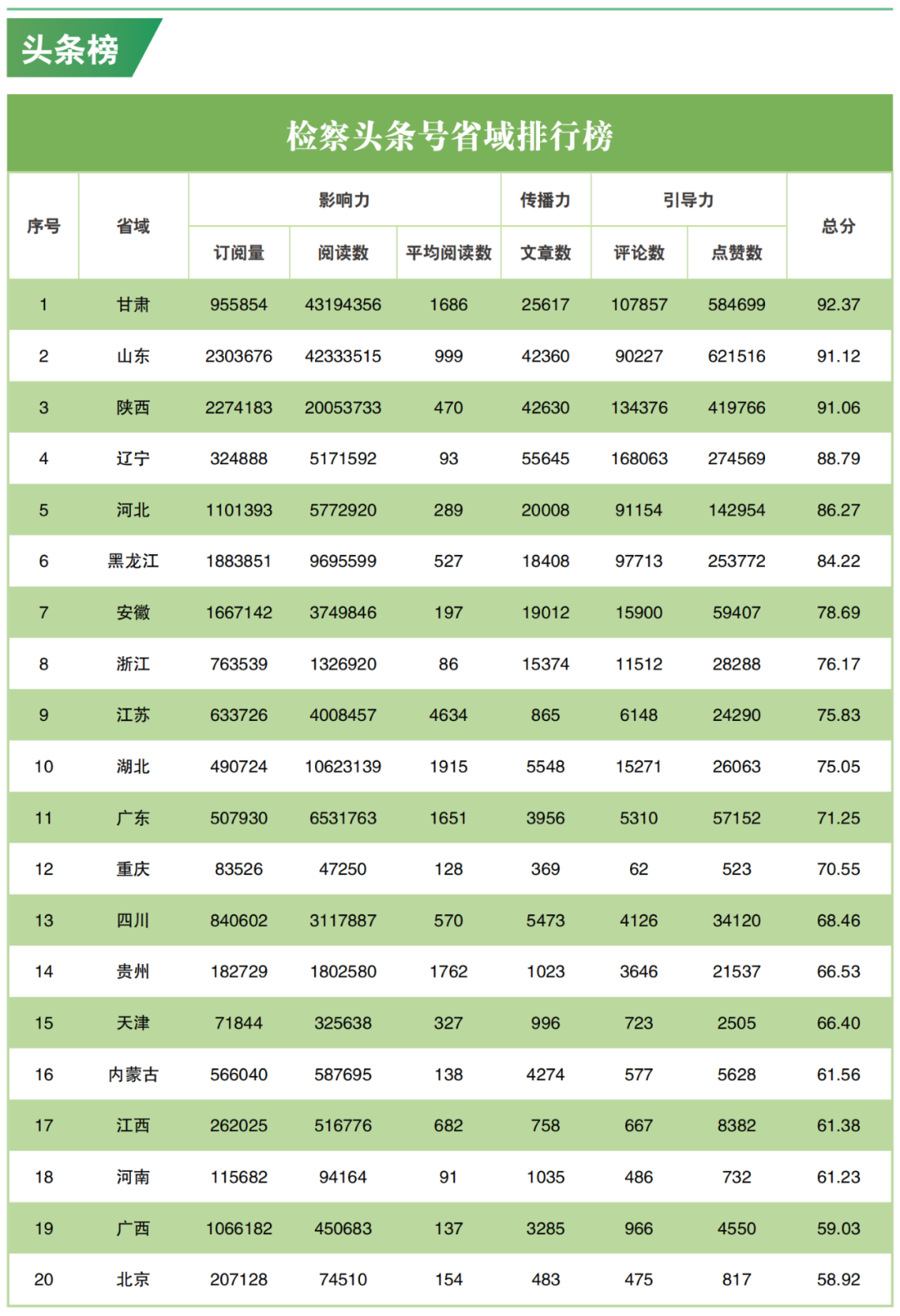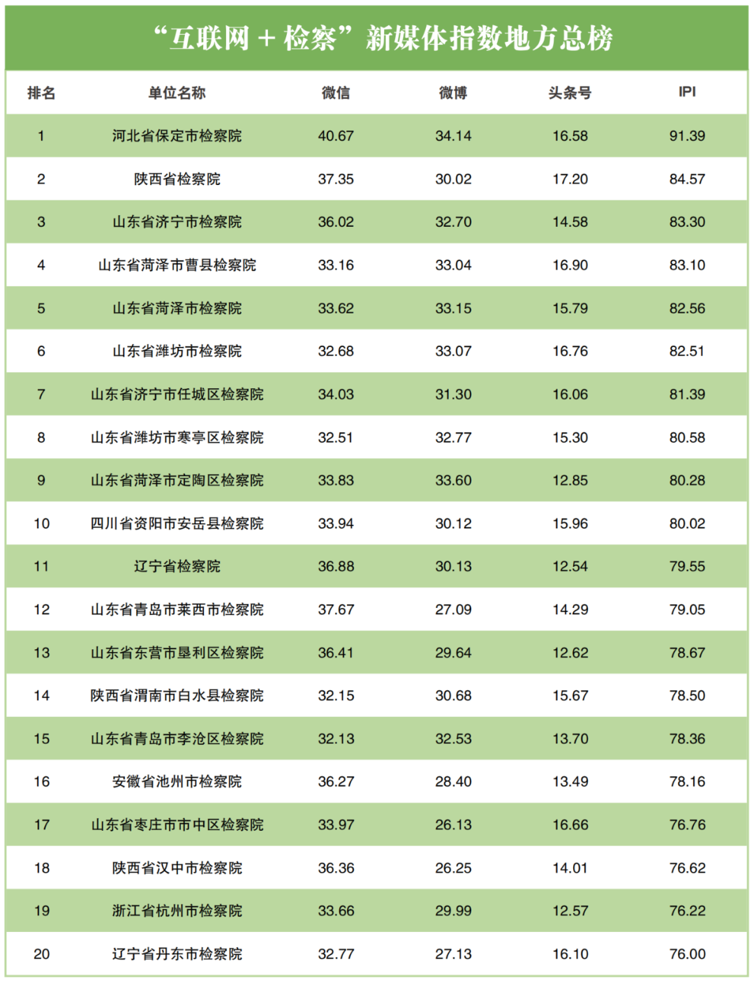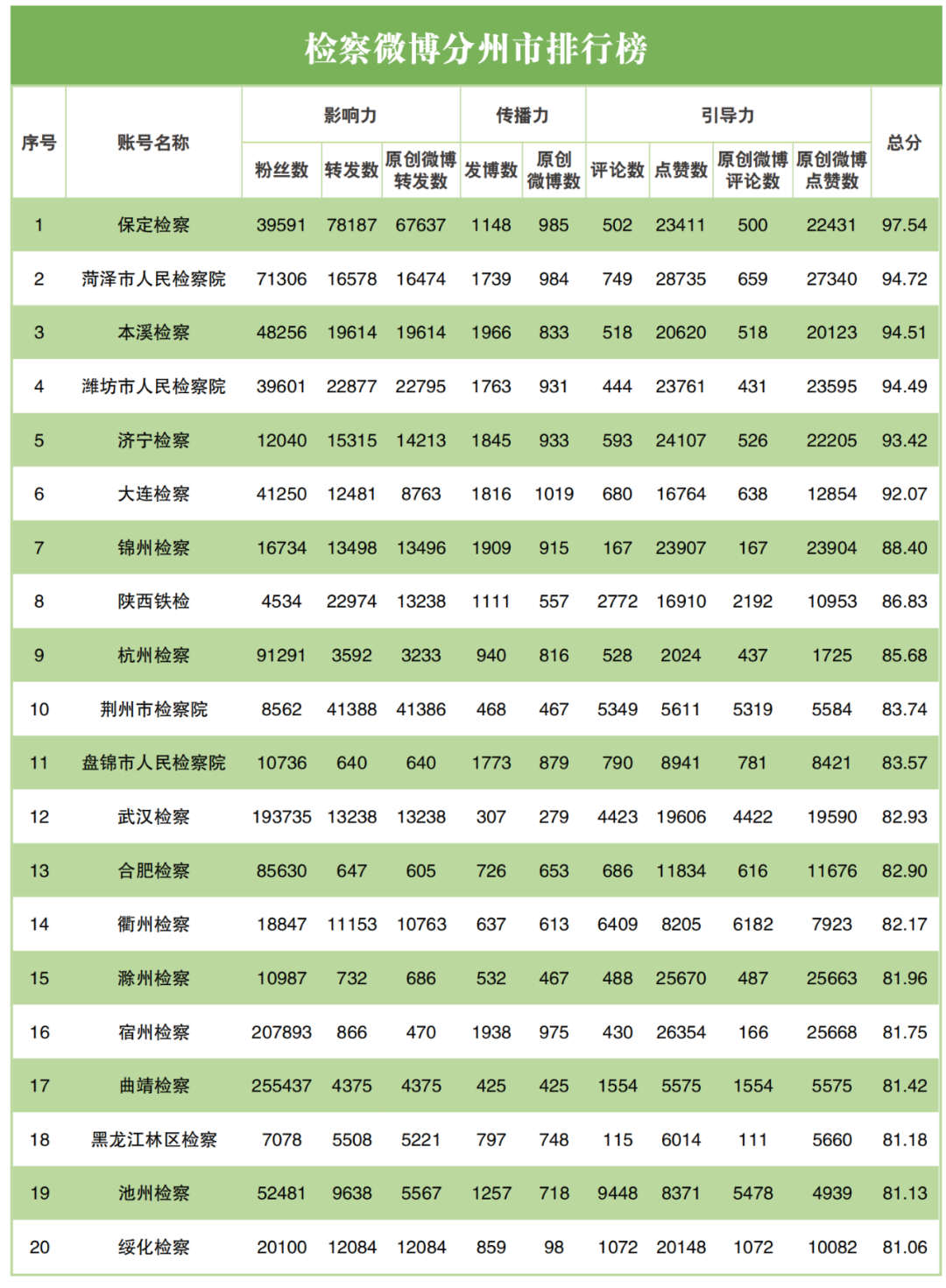 5.“互联网+检察”新媒体指数排行榜由省域榜和地方榜组成。其中,省域榜是以全国不同省级行政区域内新媒体各项基础指标的总数和均值,按照30%、70%的权重运算得出。地方榜则是以每个检察机关新媒体各项基础指标加权运算得出。