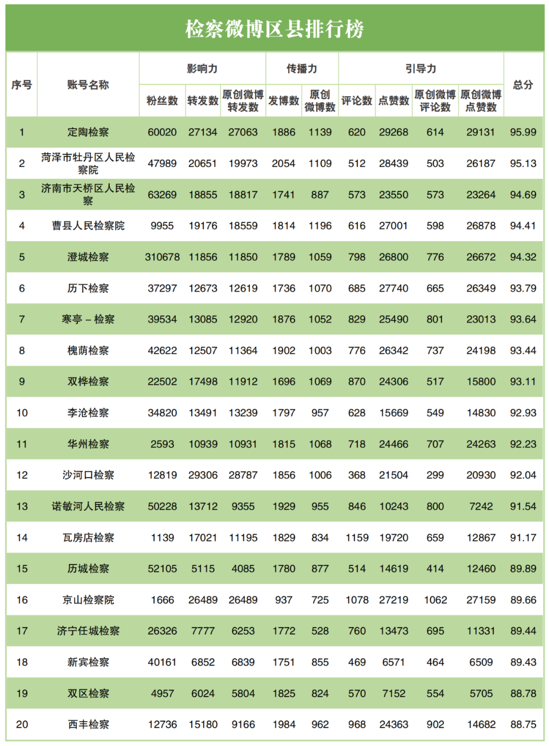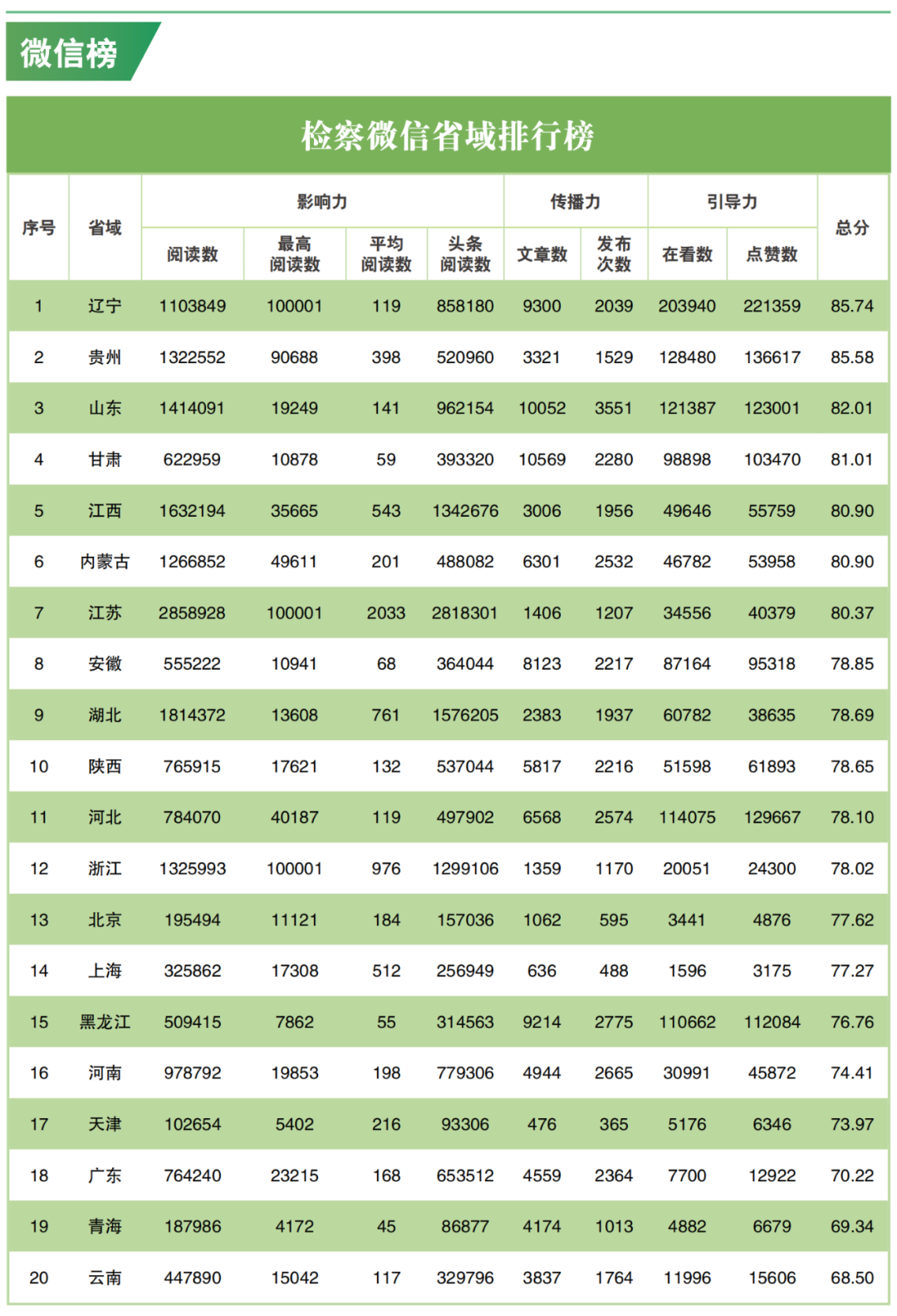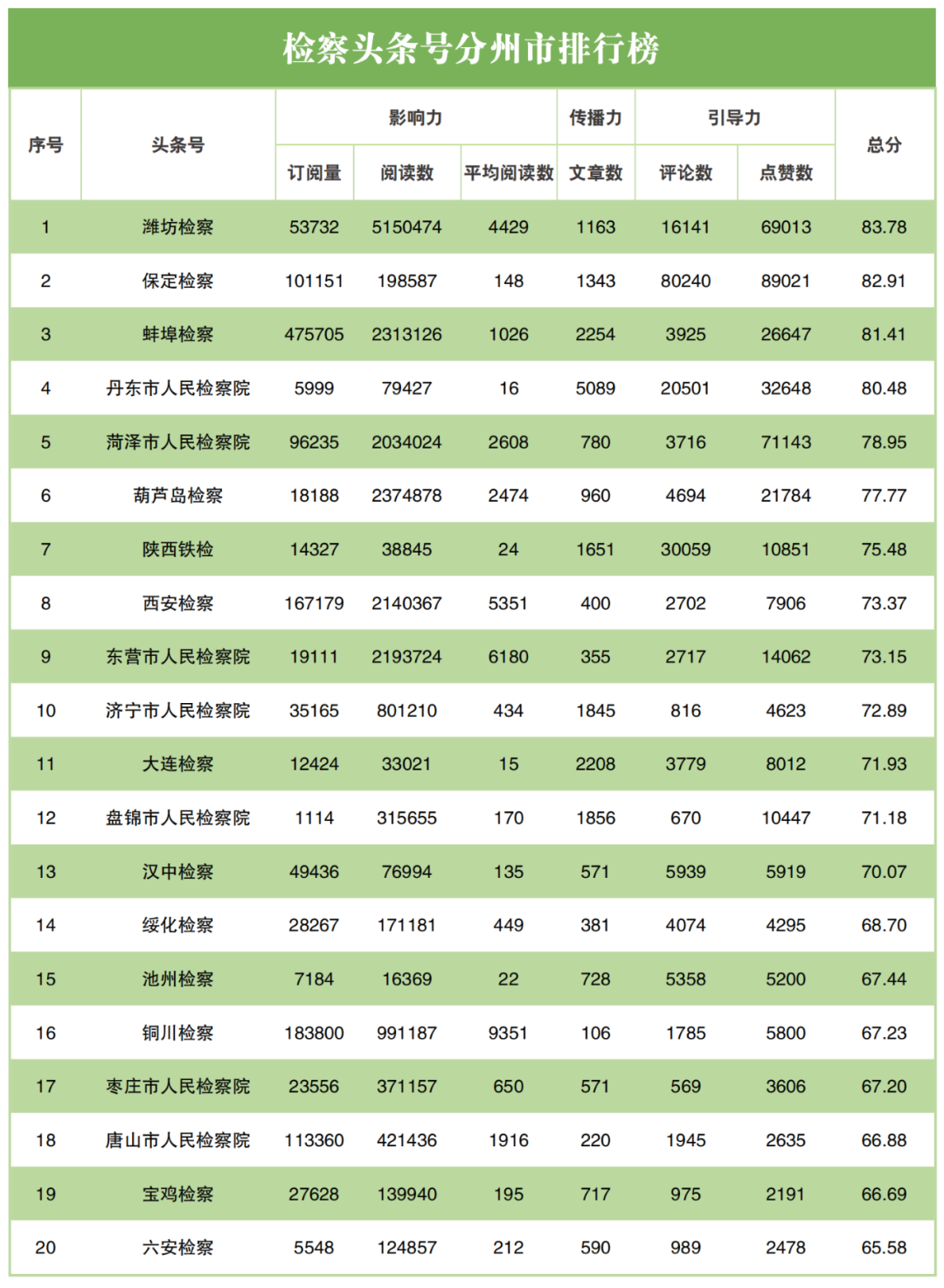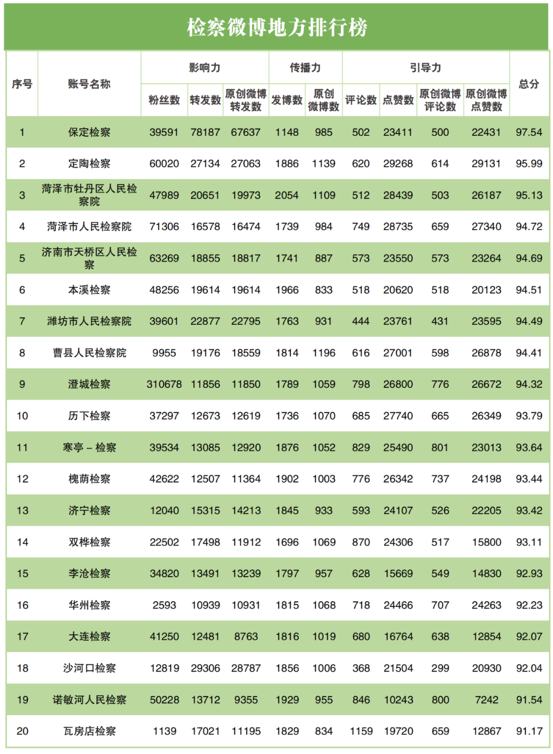 5.“互联网+检察”新媒体指数排行榜由省域榜和地方榜组成。其中,省域榜是以全国不同省级行政区域内新媒体各项基础指标的总数和均值,按照30%、70%的权重运算得出。地方榜则是以每个检察机关新媒体各项基础指标加权运算得出。