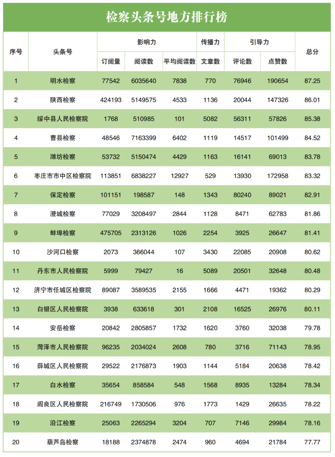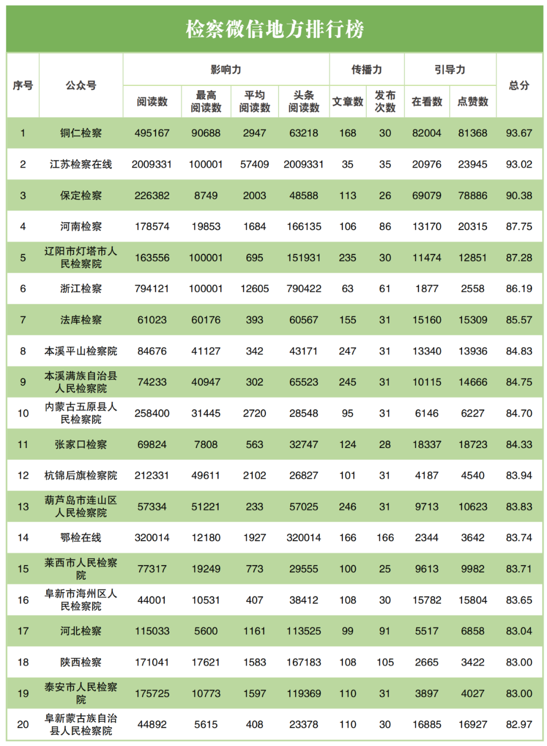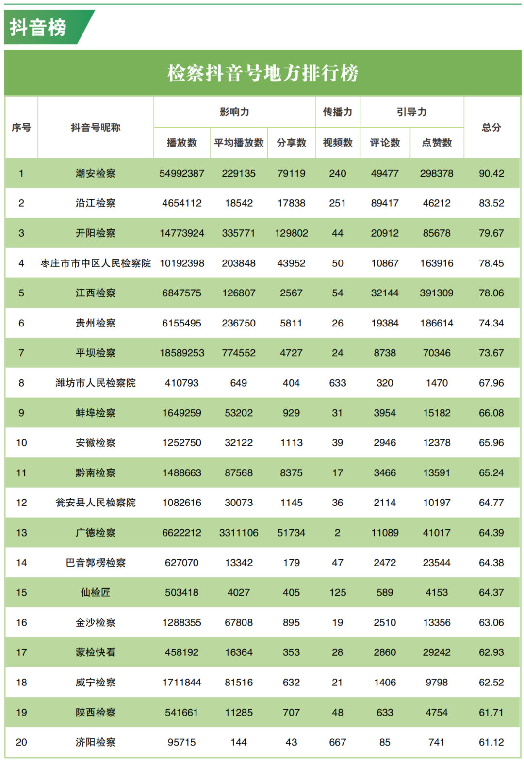 地方榜中,河北省保定市检察院、陕西省检察院、山东省济宁市检察院位居总榜前三。贵州省铜仁市检察院获得微信榜冠军,河北省保定市检察院位列微博榜首位,黑龙江省绥化市明水县检察院位居头条榜首位。地方微信榜中,江苏省检察院、贵州省铜仁市检察院、辽宁省辽阳市灯塔市检察院分别占据省级榜、分州市榜、区县榜榜首。地方微博榜中,辽宁省检察院、河北省保定市检察院、山东省菏泽市定陶区检察院分别夺得三级榜冠军。地方头条榜中,陕西省检察院、山东省潍坊市检察院、黑龙江省绥化市明水县检察院分别位居三级榜首位。地方抖音榜中,广东省潮州市潮安区检察院、黑龙江省沿江检察院、贵州省贵阳市开阳县检察院跻身前三。