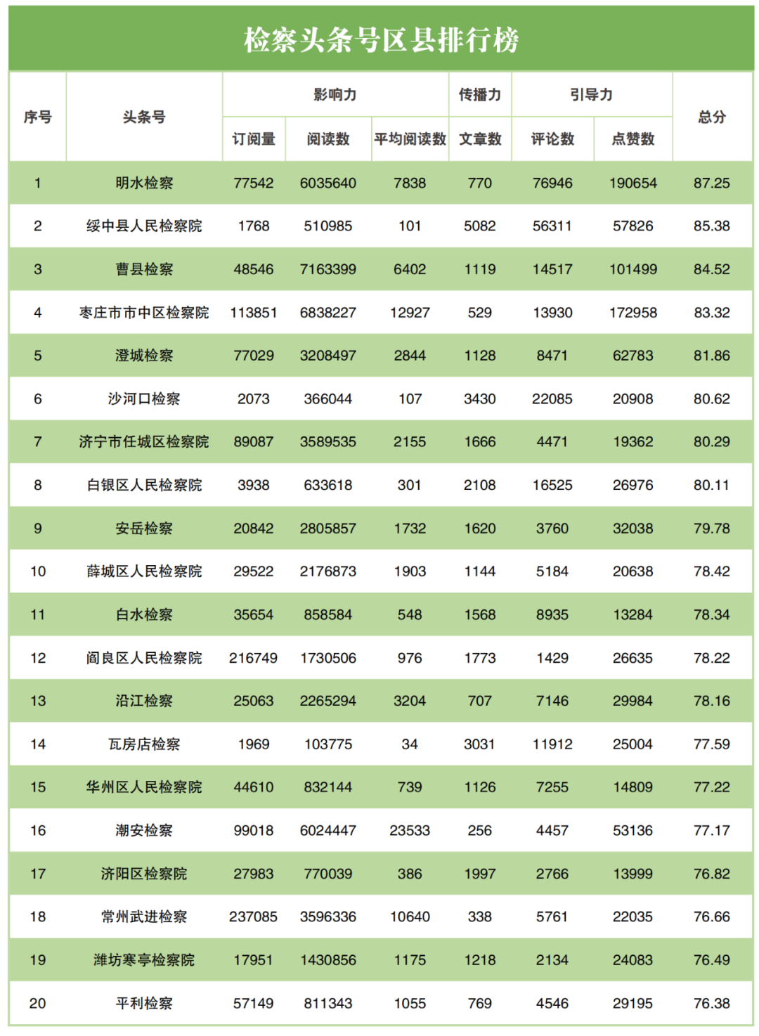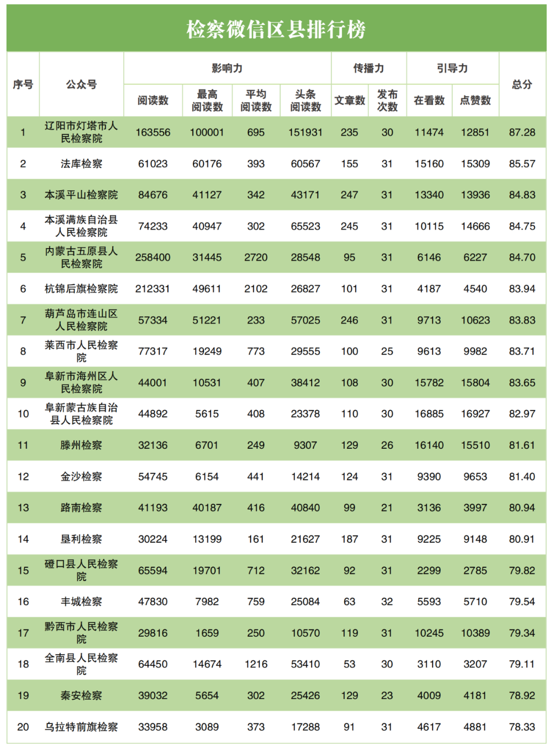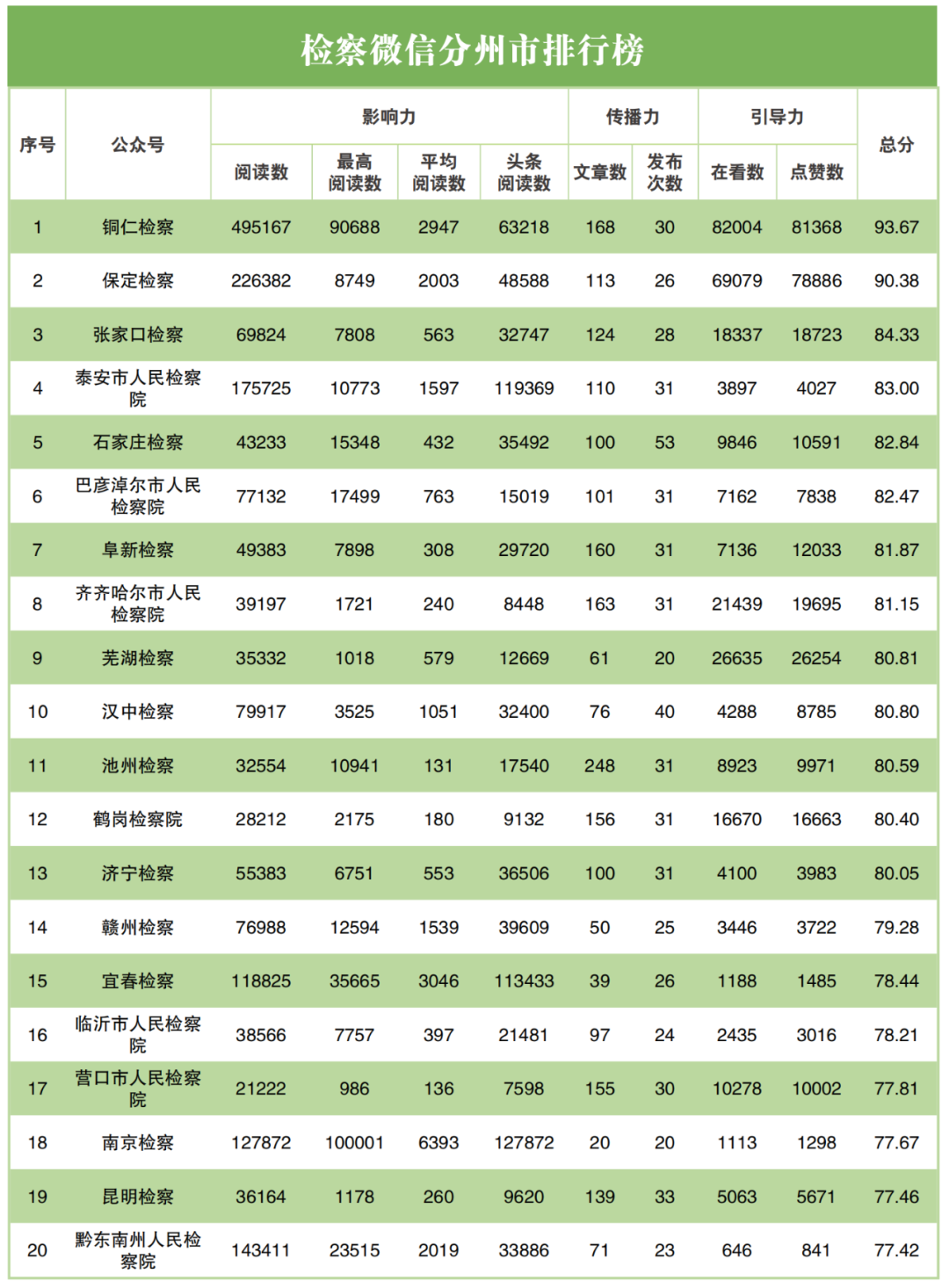 地方榜中,河北省保定市检察院、陕西省检察院、山东省济宁市检察院位居总榜前三。贵州省铜仁市检察院获得微信榜冠军,河北省保定市检察院位列微博榜首位,黑龙江省绥化市明水县检察院位居头条榜首位。地方微信榜中,江苏省检察院、贵州省铜仁市检察院、辽宁省辽阳市灯塔市检察院分别占据省级榜、分州市榜、区县榜榜首。地方微博榜中,辽宁省检察院、河北省保定市检察院、山东省菏泽市定陶区检察院分别夺得三级榜冠军。地方头条榜中,陕西省检察院、山东省潍坊市检察院、黑龙江省绥化市明水县检察院分别位居三级榜首位。地方抖音榜中,广东省潮州市潮安区检察院、黑龙江省沿江检察院、贵州省贵阳市开阳县检察院跻身前三。