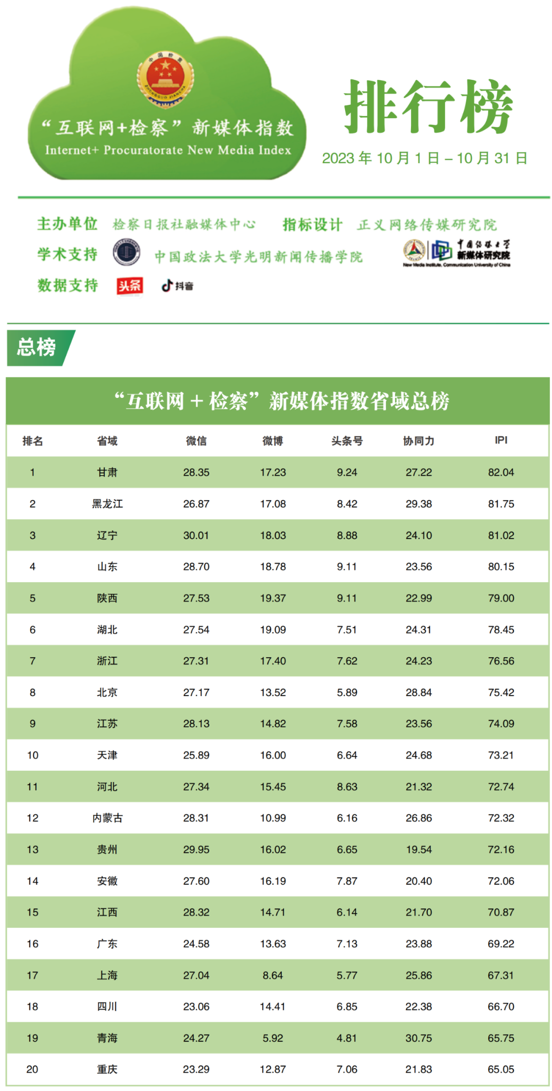 4.“互联网+检察”新媒体指数由检察微信、检察微博、检察头条号得分加权运算得出,三者所占权重分别为45%、35%、20%。2023年10月“互联网+检察”新媒体指数总榜由上述三项均进入前200名的样本中提取排名后所得。
